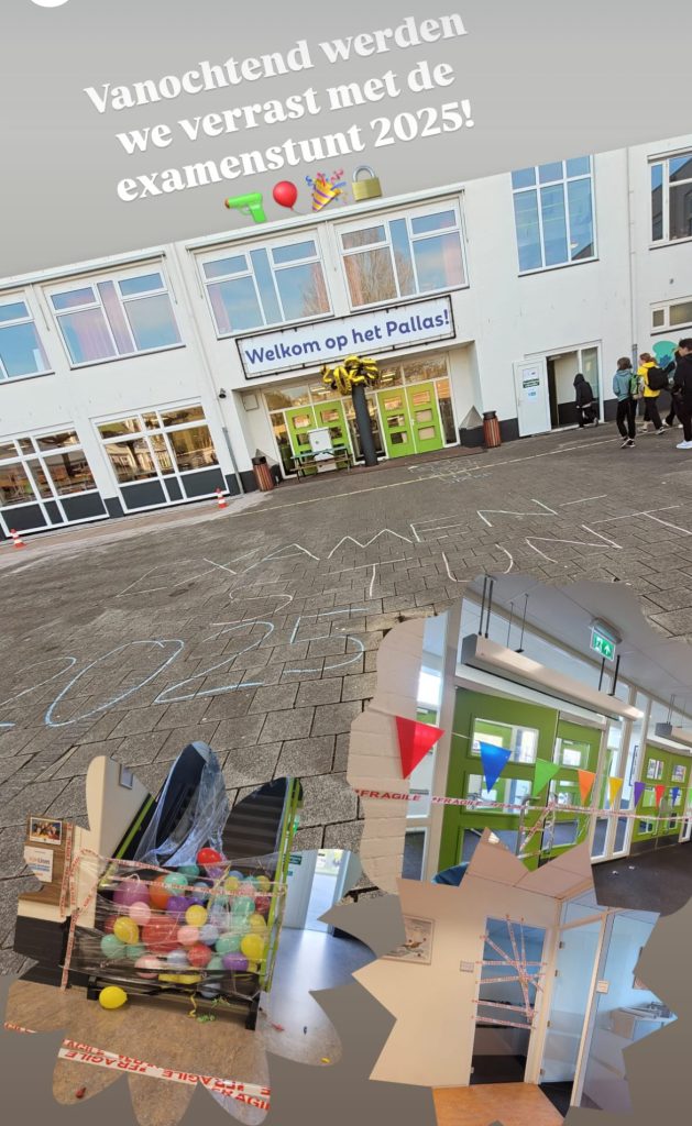 Vanochtend werden we op school enorm verrast door de examenstunt van 2025! De school was feestelijk versierd door onze examenleerlingen, met ballonnen en vlaggetjes overal. Docenten en medewerkers moesten via een heus labyrint naar binnen – zelfs de deuren waren dichtgetapet!